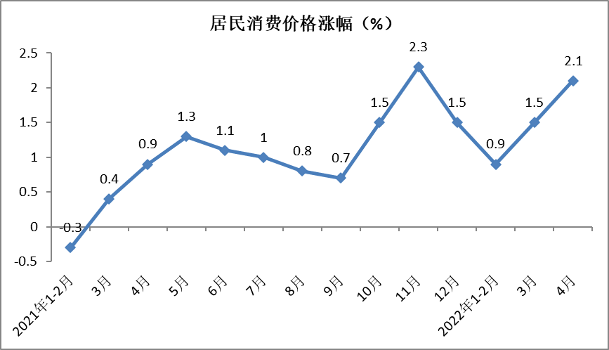 1-4月份,全国居民消费价格同比上涨1.4%,涨幅较一季度提高0.3个百分点,较上年同期提高1.2个百分点。其中,城市消费价格上涨1.5%,农村消费价格上涨1%,食品消费价格下降1.9%,非食品消费价格上涨2.1%,消费品价格上涨1.5%,服务价格上涨1.2%。4月份,全国居民消费价格同比上涨2.1%,涨幅较上月提高0.6个百分点。