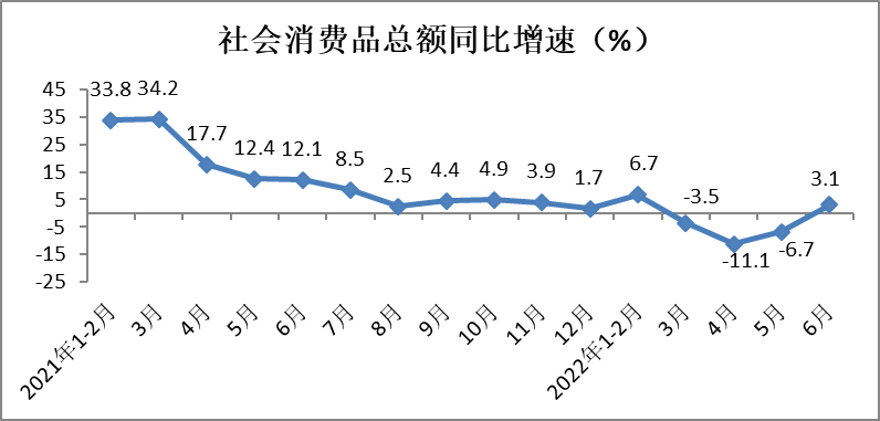 6月份,社会消费品零售总额38742亿元,同比增长3.1%,增速环比加快9.8个百分点。上半年,社会消费品零售总额210432亿元,同比下降0.7%,降幅较1-5月份收窄0.8个百分点。