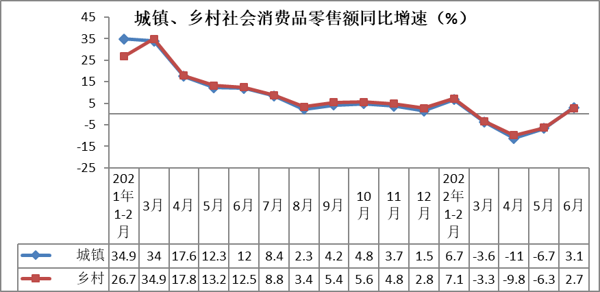 6月份,城镇消费品零售额同比增长3.1%,增速较上月大幅提高9.8个百分点,乡村消费品零售额同比增长2.7%,增速较上月大幅提高9.0个百分点。上半年,城镇消费品零售额182706亿元,同比下降0.8%,降幅较1-5月份收窄0.8个百分点。乡村消费品零售额27726亿元,同比下降0.3%,降幅较1-5月份收窄0.7个百分点。