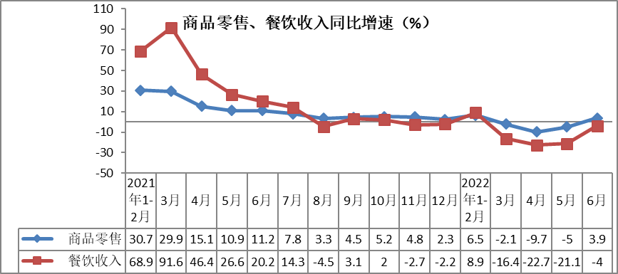 6月份,商品零售额同比增长3.9%,增速较上月提高8.9个百分点。餐饮收入同比下降4%,降幅较上月大幅收窄17.1个百分点。上半年,商品零售实现190392亿元,同比增长0.1%,增幅较1-5月份提高0.8个百分点。餐饮收入实现20040亿元,同比下降7.7%,降幅较1-5月份收窄0.8个百分点。