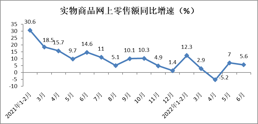 6月份实物商品网上零售额同比增长5.6%,增速较上月放缓1.4个百分点。上半年,实物商品网上零售额实现54493亿元,同比增长5.6%,增速与1-5月份持平,占社会消费品零售总额的比重为25.9%,占比较1-5月份提高1个百分点。在实物商品网上零售额中,吃类、穿类、用类商品分别增长15.7%、2.4%、5.1%。