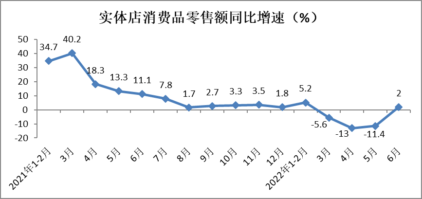 6月份实体店消费品零售额同比增长2%,增速较上月提高13.4个百分点。上半年,实体店消费品零售额实现155939亿元,同比下降2.7%,降幅较1-5月份收窄0.9个百分点。