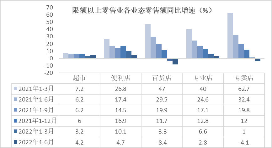 上半年,限额以上零售业单位中的超市零售额同比增长4.2%,增速较一季度提高1个百分点。便利店零售额同比增长4.7%,增速较一季度放缓5.4个百分点。专业店零售额同比增长2.8%,增速较一季度放缓3.8个百分点。百货店零售额同比下降8.4%,降幅较一季度扩大5.1个百分点。专卖店零售额同比下降4.1%,增速较一季度回落5.1个百分点。