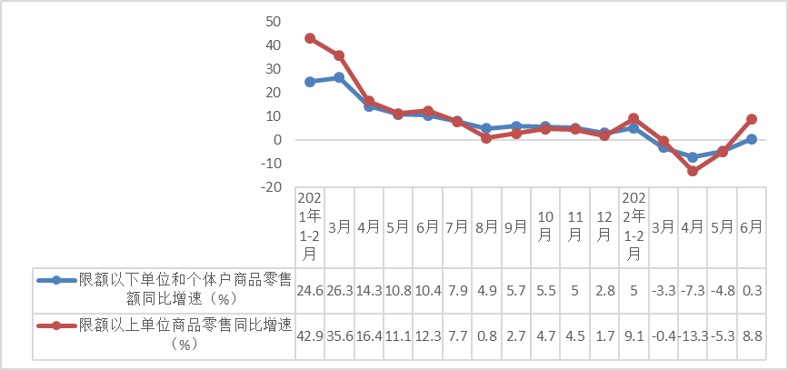6月份,限额以上单位商品零售额同比增长8.8%,增速较5月份大幅提高14.1个百分点。据测算,6月份限额以下单位和个体户商品零售额同比增长0.3%,增速较5月份提高5.1个百分点。上半年,限额以下单位和个体户商品零售额实现114040亿元,同比下降0.8%,增速较1-5月份收窄0.2个百分点。