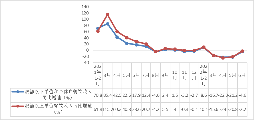 6月份,限额以上单位餐饮收入同比下降2.2%,降幅较5月份大幅收窄18.6个百分点。据测算,6月份限额以下单位和个体户餐饮收入同比下降4.6%,降幅较上月收窄16.6个百分点。上半年,限额以下单位和个体户餐饮收入实现15161亿元,同比降低7.7%,降幅较1-5月份收窄0.6个百分点。