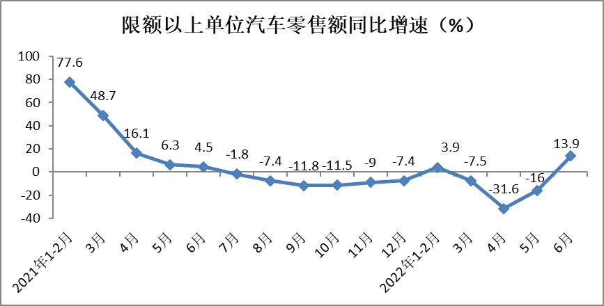 在购置税减征、放宽限购、以旧换新等一系列促进汽车消费政策的推动下,6月份限额以上单位汽车类零售额同比增长13.9%,增速较上月大幅提高29.9个百分点,对社会消费品零售总额的增长贡献率高达47.7%。上半年,限额以上单位汽车类零售额实现21181亿元,同比下降5.7%,降幅较1-5月份收窄4.2个百分点。