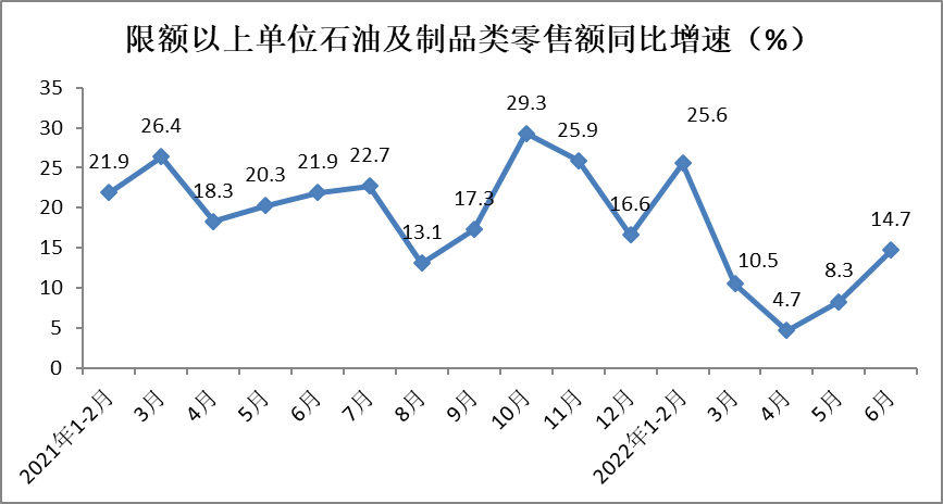 6月份限额以上单位石油及制品类零售额同比增长14.7%,增速较上月加快6.4个百分点,对社会消费品零售总额的增长贡献率高达23.3%。上半年,限额以上单位石油及制品类零售额实现11129亿元,同比增长14.7%,增速较1-5月份加快0.6个百分点。