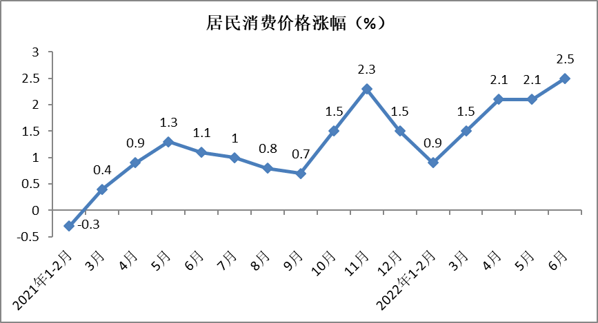6月份,全国居民消费价格同比上涨2.5%,涨幅较上月加快0.4个百分点,较上年同期提高1.4个百分点。上半年,全国居民消费价格同比上涨1.7%,涨幅较1-5月份提高0.2个百分点,较上年同期提高1.2个百分点。