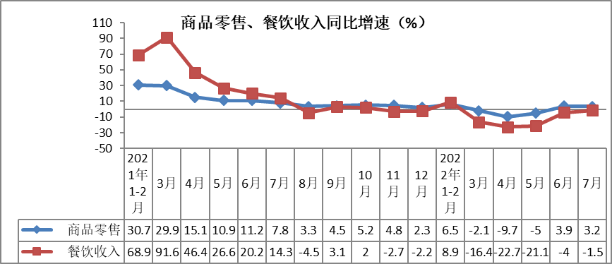 1-7月份,商品零售实现222568亿元,同比增长0.5%,增幅较上半年提高0.4个百分点。餐饮收入实现23734亿元,同比下降6.8%,降幅较上半年收窄0.9个百分点。7月份,商品零售额同比增长3.2%,增速较上月放缓0.7个百分点。餐饮收入同比下降1.5%,降幅较上月收窄2.5个百分点。
