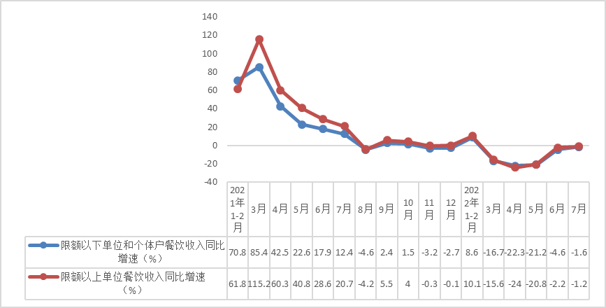 据测算,1-7月份限额以下单位和个体户餐饮收入实现17887亿元,同比下降6.8%,降幅较上半年收窄0.8个百分点。其中,7月份限额以下单位和个体户餐饮收入同比下降1.6%,降幅较6月份收窄3个百分点,降幅大于限额以上单位餐饮收入降幅0.4个百分点。