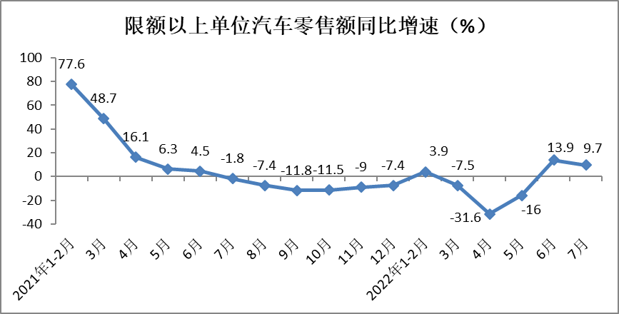 1-7月份,限额以上单位汽车类零售额实现24970亿元,同比下降3.6%,降幅较上半年收窄2.1个百分点。受汽车促消费政策效果边际减弱,叠加市场淡季因素影响,7月份限额以上单位汽车类零售额同比增长9.7%,增速较上月回落4.2个百分点。