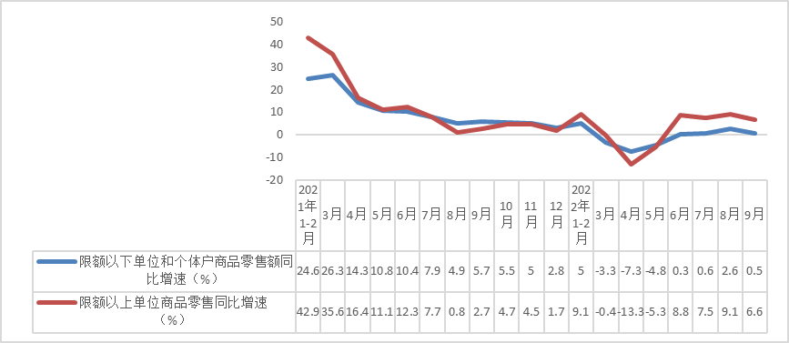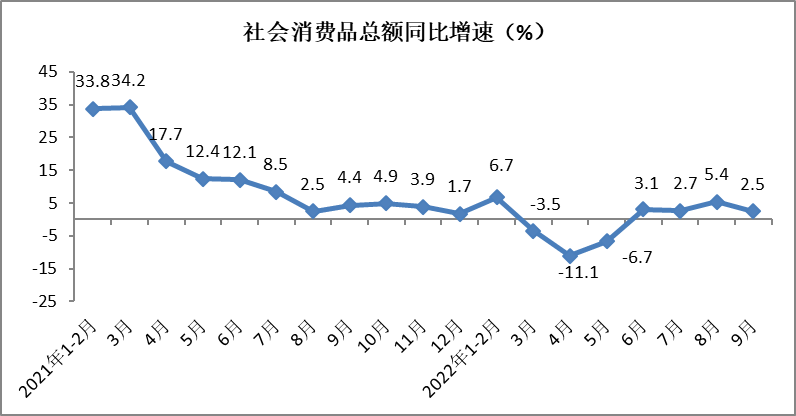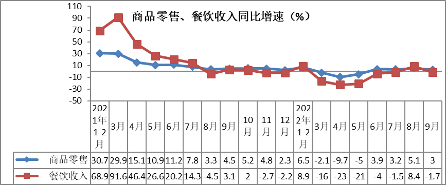 受疫情多点散发影响,9月份市场销售增速有所回落。9月份,社会消费品零售总额实现37745亿元,同比增长2.5%,增速较8月份回落2.9个百分点,较去年同期回落1.9个百分点。前三季度,社会消费品零售总额实现320305亿元,同比增长0.7%,增速比1—8月份加快0.2个百分点。其中,一季度增长3.3%,二季度下降4.6%,三季度增长3.5%,三季度较二季度加快恢复。