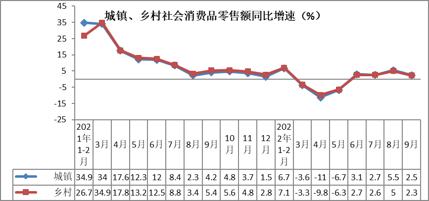 9月份,城镇消费品零售额同比增长2.5%,增速较8月份回落3个百分点。乡村消费品零售额同比增长2.3%,增速较8月份回落2.7个百分点。前三季度,城镇消费品零售额277753亿元,同比增长0.7%,增速较1-8月份提高0.3个百分点。乡村消费品零售额42552亿元,同比增长0.9%,增速较1-8月份提高0.2个百分点。在乡村振兴持续推进、农村物流体系和商业设施不断完善等因素带动下,乡村消费品市场增速快于城镇0.2个百分点。