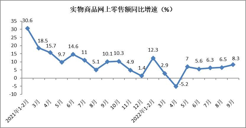 9月份,实物商品网上零售额同比增长8.3%,增速较8月份加快1.8个百分点。前三季度,全国实物商品网上零售额实现82374亿元,同比增长6.1%,增速明显快于社会消费品零售总额,继续保持较快增长。网上消费占比持续提升,实物商品网上零售额占社会消费品零售总额的比重为25.7%,比2021年前三季度提高2.1个百分点。实物商品网上零售额对社会消费品零售总额的增长贡献率达到212.7%,高于2021年前三季度190.6个百分点。