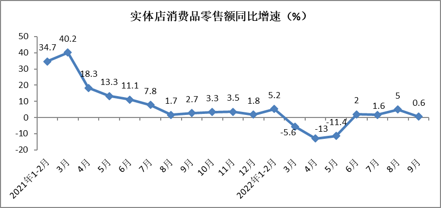 9月份,实体店消费品零售额同比增长0.6%,增速较8月份回落4.4个百分点。前三季度,实体店消费品零售额实现237931亿元,同比下降1%,降幅较1-8月份收窄0.2个百分点。