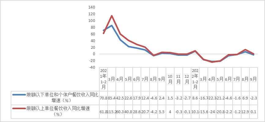 据测算,9月份限额以下单位和个体户餐饮收入同比下降2.3%,增速较8月份回落9.2个百分点,低于限额以上单位餐饮收入2.4个百分点。前三季度,限额以下单位和个体户餐饮收入实现23415亿元,同比下降4.8%,降幅较1-8月份收窄0.4个百分点,降幅大于限额以上单位餐饮收入降幅0.9个百分点。