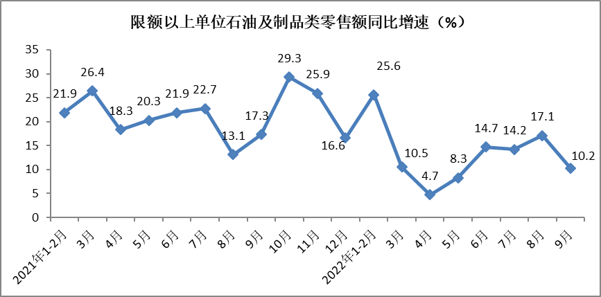 9月份限额以上单位石油及制品类零售额同比增长10.2%,增速较8月份回落6.9个百分点。前三季度,限额以上单位石油及制品类零售额实现17099亿元,同比增长14%,增速较1-8月份回落0.5个百分点。