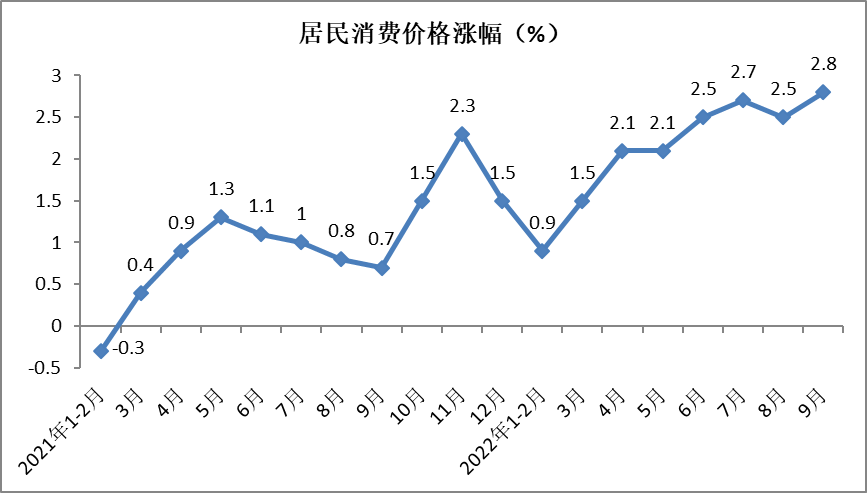 9月份,全国居民消费价格(CPI)同比上涨2.8%,涨幅较8月份提高0.3个百分点,较上年同期加快2.1个百分点。前三季度,全国居民消费价格温和上涨2%,涨幅较1-8月份提高0.1个百分点,较上年同期加快1.4个百分点。