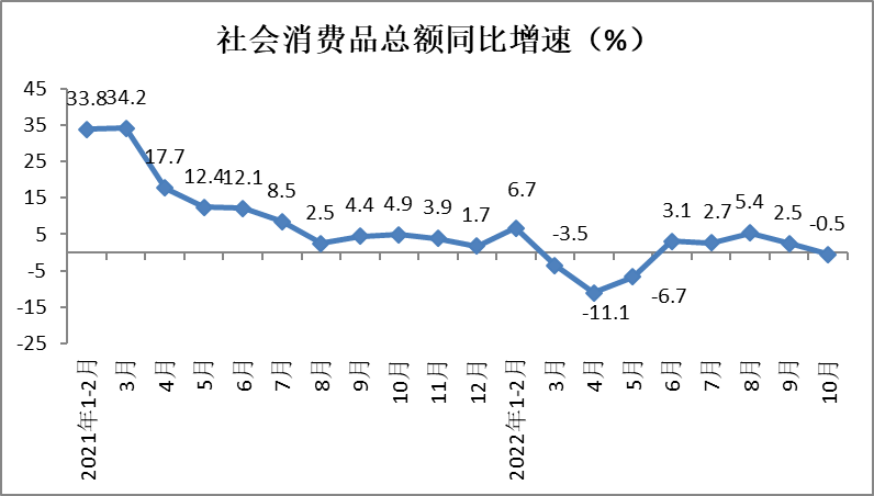 10月份,城镇消费品零售额同比下降0.6%,增速环比回落3.1个百分点。乡村消费品零售额同比增长0.2%,增速虽环比回落2.1个百分点,但快于城镇消费0.8个百分点。1-10月份,城镇消费品零售额312649亿元,同比增长0.5%,增速较前三季度放缓0.2个百分点。乡村消费品零售额47926亿元,同比增长0.8%,增速较前三季度放缓0.1个百分点,但快于城镇消费0.3个百分点。