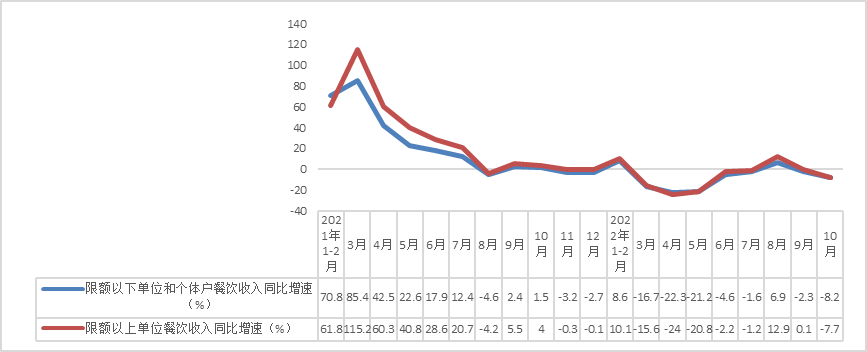 据测算,10月份限额以下单位和个体户餐饮收入同比下降8.2%,降幅环比扩大5.9个百分点,降幅大于限额以上单位餐饮收入0.5个百分点。1-10月份,限额以下单位和个体户餐饮收入实现26516亿元,同比下降5.2%,降幅较前三季度扩大0.4个百分点,降幅大于限额以上单位餐饮收入降幅0.9个百分点。