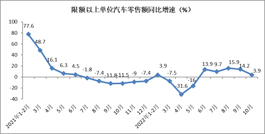 10月份限额以上单位汽车类零售额同比增长3.9%,增速环比大幅回落10.3个百分点。1-10月份,限额以上单位汽车类零售额实现36873亿元,同比增长0.8%,增速较前三季度加快0.4个百分点。