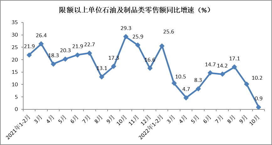 10月份限额以上单位石油及制品类零售额同比增长0.9%,增速环比大幅回落9.3个百分点。1-10月份,限额以上单位石油及制品类零售额实现19080亿元,同比增长12.5%,增速较前三季度放缓1.5个百分点。