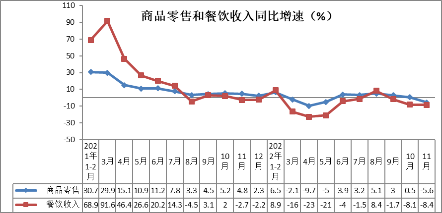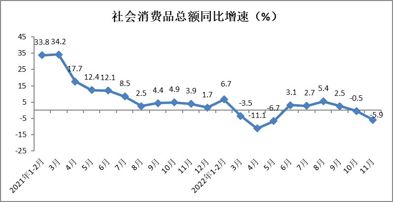 11月份本土疫情波及全国多数省份,居民出行减少、消费场景受限,消费市场明显承压,市场销售降幅有所扩大。11月份,社会消费品零售总额实现38615亿元,同比下降5.9%,降幅环比扩大5个百分点。1-11月份,社会消费品零售总额实现399190亿元,同比下降0.1%,增速低于1-10月份0.7个百分点。