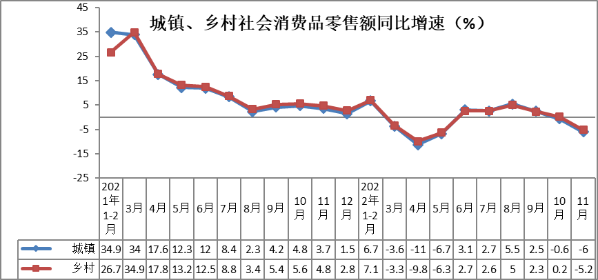 11月份,城镇消费品零售额同比下降6%,降幅环比扩大5.4个百分点。乡村消费品零售额同比下降5.2%,降幅低于城镇0.8个百分点。1-11月份,城镇消费品零售额345853亿元,同比下降0.1%,增速较1-10月份回落0.6个百分点。乡村消费品零售额53337亿元,同比增长0.2%,增速较1-10月份回落0.6个百分点。