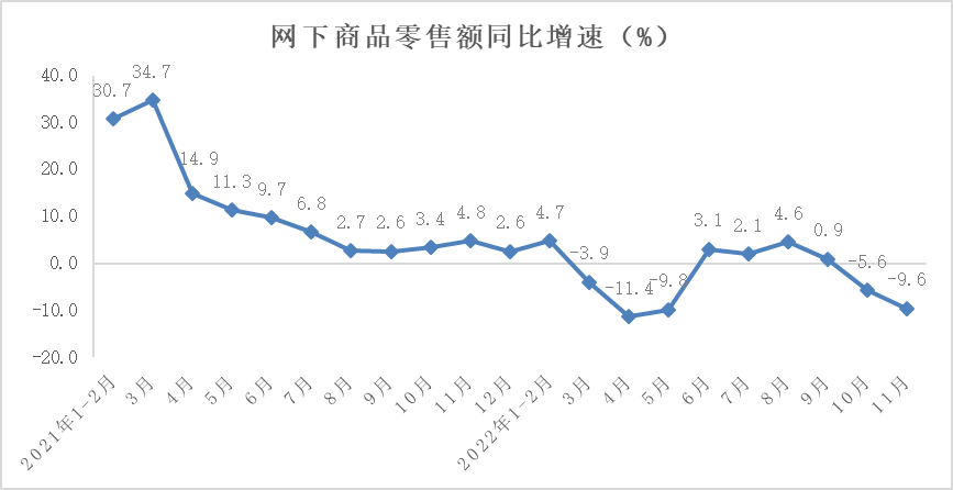 经测算,11月份,网下商品零售额同比下降9.6%,降幅环比扩大4个百分点。1-11月份,网下商品零售额实现251308亿元,同比下降1.8%,降幅较1-10月份扩大0.7个百分点。