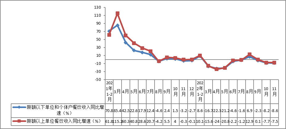 据测算,11月份限额以下单位和个体户餐饮收入同比下降8.6%,降幅环比扩大0.4个百分点,大于限额以上单位餐饮收入1.1个百分点。1-11月份,限额以下单位和个体户餐饮收入实现30039亿元,同比下降5.7%,降幅较1-10月份扩大0.5个百分点。