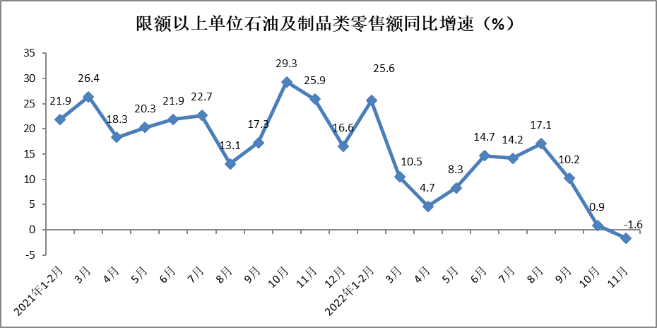 11月份限额以上单位石油及制品类零售额同比下降1.6%,增速环比大幅回落2.5个百分点。1-11月份,限额以上单位石油及制品类零售额实现21034亿元,同比增长11%,增速较1-10月份放缓1.5个百分点。