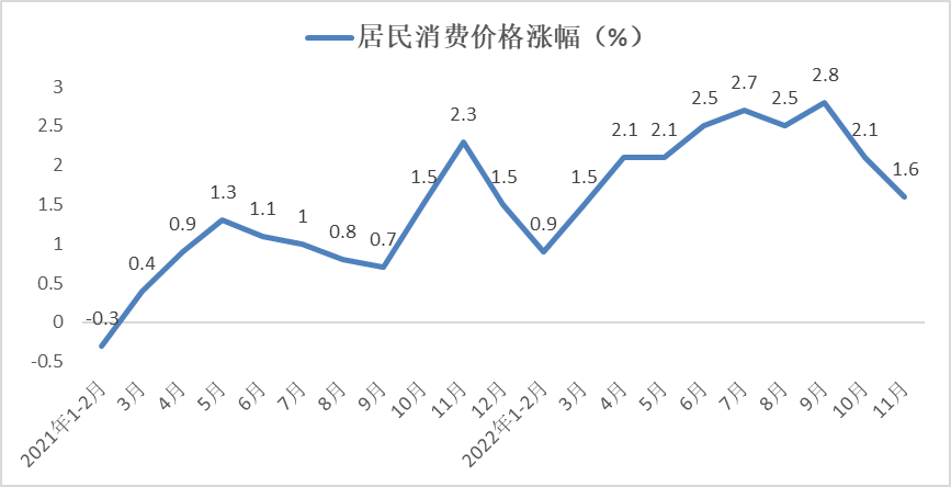 11月份,全国居民消费价格同比上涨1.6%,涨幅环比回落0.5个百分点,涨幅较上年同期回落0.7个百分点。其中,11月份食品烟酒类价格同比上涨3%,涨幅环比回落2.2个百分点;衣着类价格同比上涨0.5%,涨幅环比持平;居住类价格同比下降0.2%,降幅环比持平;生活用品及服务类价格同比上涨1.5%,涨幅环比微增0.1个百分点;交通通信类价格同比上涨2.9%,涨幅环比回落0.2个百分点;教育文化娱乐类价格同比上涨1.3%,涨幅环比微增0.1个百分点;医疗保健类价格同比上涨0.5%,涨幅环比持平;其他用品及服务类价格同比上涨2.3%,涨幅环比提高0.4个百分点。1-11月份,全国居民消费价格温和平稳上涨2%,涨幅较上年同期提高1.1个百分点。