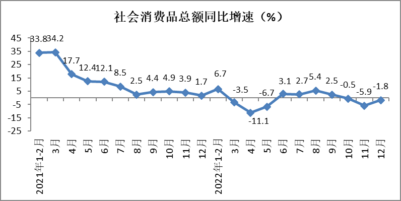 2022年12月份,社会消费品零售总额实现40542亿元,同比下降1.8%,降幅环比收窄4.1个百分点。2022年全年,社会消费品零售总额实现439733亿元,同比下降0.2%,降幅较1-11月份略微扩大0.1个百分点。