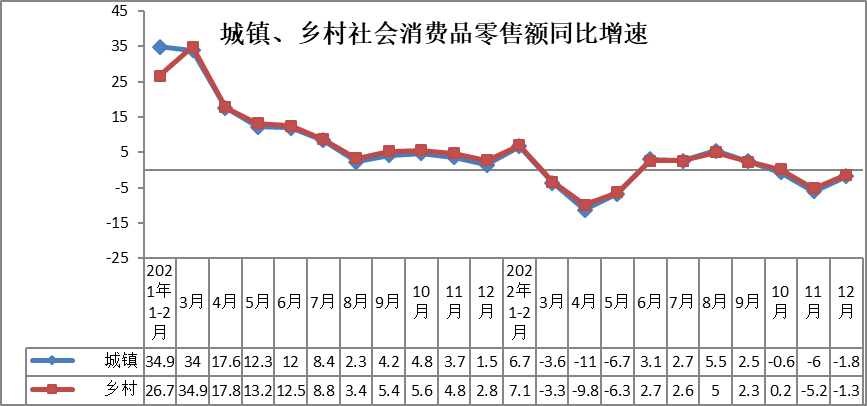 2022年12月份,城镇消费品零售额同比下降1.8%,降幅环比收窄4.2个百分点。乡村消费品零售额同比下降1.3%,降幅环比收窄3.9个百分点。2022年全年,城镇消费品零售额实现380448亿元,同比下降0.3%,降幅较1-11月份扩大0.2个百分点。乡村消费品零售额59285亿元,与上年基本持平,增速较1-11月份回落0.2个百分点。
