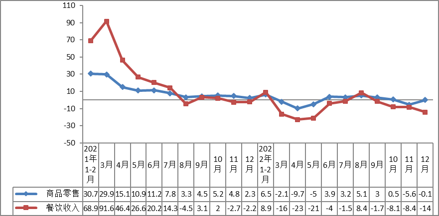 2022年12月份,商品零售同比下降0.1%,降幅环比收窄5.5个百分点。餐饮收入同比下降14%,降幅环比扩大5.6个百分点。2022年全年,商品零售实现395792亿元,同比增长0.5%,增速与1-11月份持平。餐饮收入实现43941亿元,同比下降6.3%,降幅较1-11月份扩大0.9个百分点。