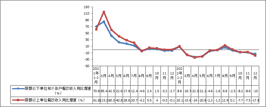 据测算,2022年12月份限额以下单位和个体户餐饮收入同比下降13%,降幅环比扩大4.4个百分点。2022年全年,限额以下单位和个体户餐饮收入实现33291亿元,同比下降6.4%,降幅较1-11月份扩大0.7个百分点。