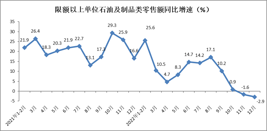 2022年12月份限额以上单位石油及制品类零售额同比下降2.9%,降幅环比扩大1.3个百分点。2022年全年,限额以上单位石油及制品类零售额实现22998亿元,同比增长9.7%,增速较1-11月份放缓1.3个百分点。