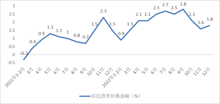 2022年12月份,全国居民消费价格同比上涨1.8%,涨幅环比提升0.2个百分点。其中,食品价格上涨4.8%,涨幅环比扩大1.1个百分点,非食品价格上涨1.1%,涨幅环比持平。2022年全年,全国居民消费价格温和平稳上涨2%,涨幅较上年提升1.1个百分点。分类别看,食品烟酒价格上涨2.4%,涨幅提升2.7个百分点;衣着价格上涨0.5%,涨幅提升0.2个百分点;居住价格上涨0.7%,涨幅收窄0.1个百分点;生活用品及服务价格上涨1.2%,涨幅提升0.8个百分点;交通通信价格上涨5.2%,涨幅提升1.1个百分点;教育文化娱乐价格上涨1.8%,涨幅收窄0.1个百分点;医疗保健价格上涨0.6%,涨幅提升0.2个百分点;其他用品及服务价格上涨1.6%,涨幅提升2.9个百分点。