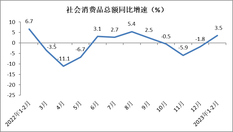 在疫情防控较快平稳转段,刺激消费政策落实显效,元旦、春节消费需求集中释放等有利因素推动下,1-2月份,社会消费品零售总额实现77067亿元,同比增长3.5%,增速自去年10月份首次转正,较去年12月份提高5.3个百分点。