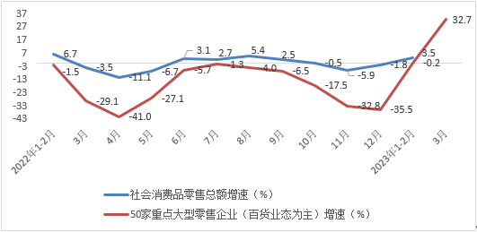 根据乐鱼电竞的监测数据,在促消费政策持续发力、国内消费市场加速恢复向好环境下,加之去年同期基数较低因素,3月份全国50家重点大型零售企业(以百货业态为主)实现大幅增长,零售额同比增长32.7%,其中36家企业零售额实现同比正增长。