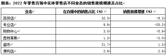 2022年我国经济发展遇到疫情等国内外多重超预期因素冲击,终端消费也直接受到冲击。根据中国商业联合会和乐鱼电竞的统计数据,2022年中国商业零售百强企业(以下简称百强企业)的销售规模为3.3万亿元,同比下降了4.2%(按可比口径计算),与社会消费品零售总额增速相比,百强企业增速低于社会消费品零售总额增速4.0个百分点。