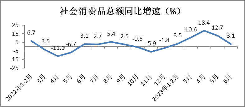 其中,6月份,社会消费品零售总额实现39951亿元,同比增长3.1%,增速较5月份放缓9.6个百分点。