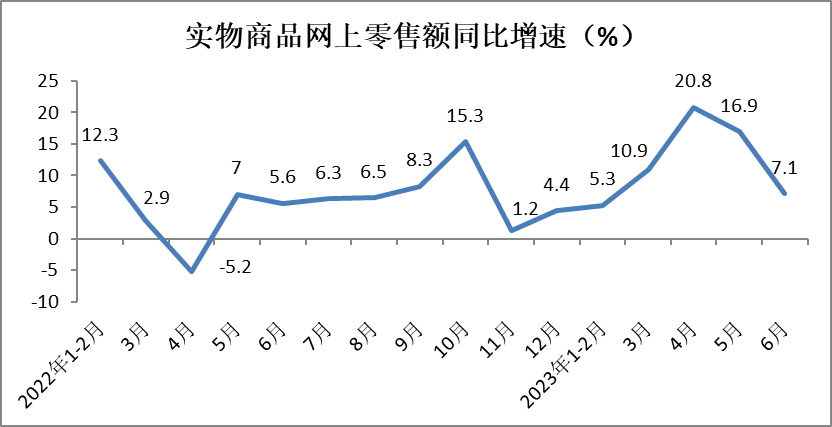 上半年,实物商品网上零售额实现60623亿元,同比增长10.8%,增速较一季度加快3.5个百分点。上半年,实物商品网上零售额占社会消费品零售总额的比重为26.6%,占比较一季度提高2.4个百分点。经测算,6月份,实物商品网上零售额同比增长7.1%,增速较5月份放缓9.8个百分点。