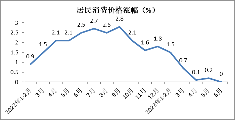 6月份,全国居民消费价格与上年同期持平,涨幅较5月份收窄0.2个百分点。其中,食品类价格同比上涨2.3%,非食品类价格同比降低0.6%,消费品类价格同比降低0.5%,服务类价格同比上涨0.7%。