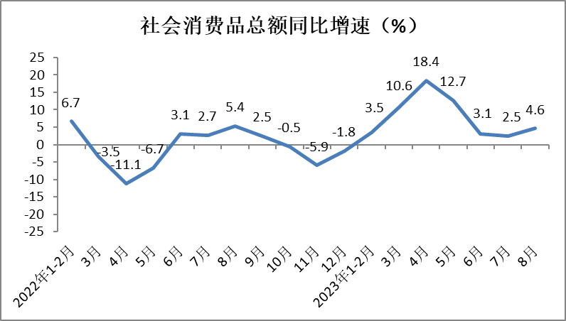 8月份,社会消费品零售总额实现37933亿元,同比增长4.6%,增速较7月份加快2.1个百分点。1-8月份,社会消费品零售总额302281亿元,同比增长7%,增速较1-7月份放缓0.3个百分点。