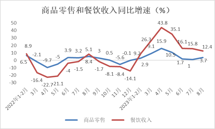 8月份,商品零售实现33721亿元,同比增长3.7%,增速较7月份加快2.7个百分点。餐饮收入实现4212亿元,同比增长12.4%,增速较7月份放缓3.4个百分点。