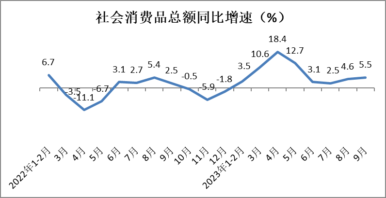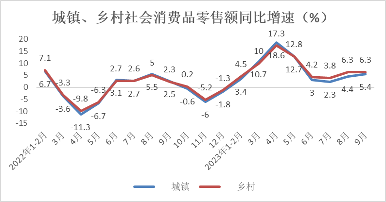 9月份,城镇消费品零售额实现33985亿元,同比增长5.4%,增速较8月份加快1个百分点;乡村消费品零售额实现5841亿元,同比增长6.3%,增速与上月持平,快于城镇0.9个百分点。