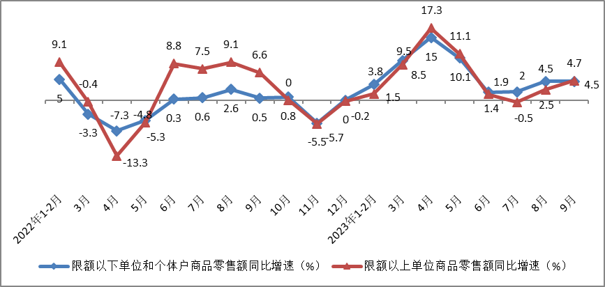 经测算,9月份限额以下单位和个体户商品零售额同比增长4.5%,增速8月份持平。前三季度,限额以下单位和个体户商品零售额实现185279亿元,同比增长5.9%,增速较1-8月份放缓0.1个百分点。