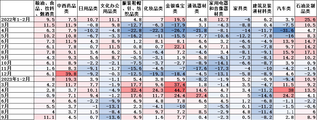9月份,限额以上单位商品零售中,粮油食品和饮料烟酒类、中西药品类、服装鞋帽和针纺织品类、金银珠宝类、汽车类、石油及制品类商品零售额同比增长11.1%、4.5%、9.9%、7.7%、2.8%、8.9%,增速较上月有所加快。日用品类、化妆品类、通讯器材类、家具类商品零售额均实现正增长。家用电器和音响器材类、建筑及装潢材料类商品零售额降幅收窄。