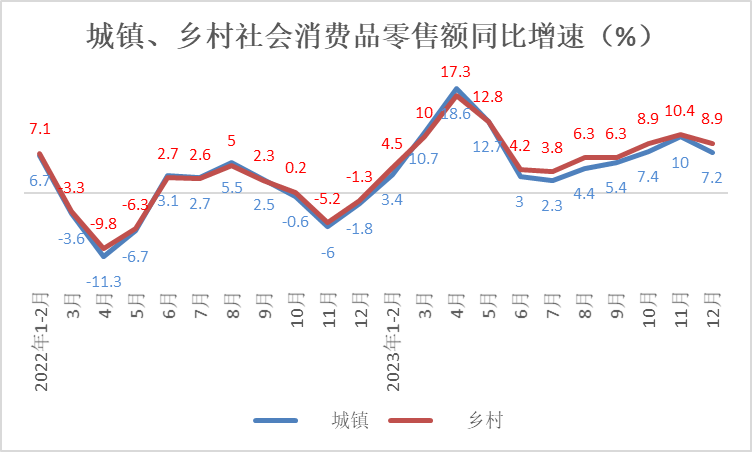 12月份,城镇消费品零售额实现37071亿元,同比增长7.2%,增速较11月份放缓2.8个百分点;乡村消费品零售额实现6479亿元,同比增长8.9%,增速较11月份放缓1.5个百分点,快于城镇1.7个百分点。
